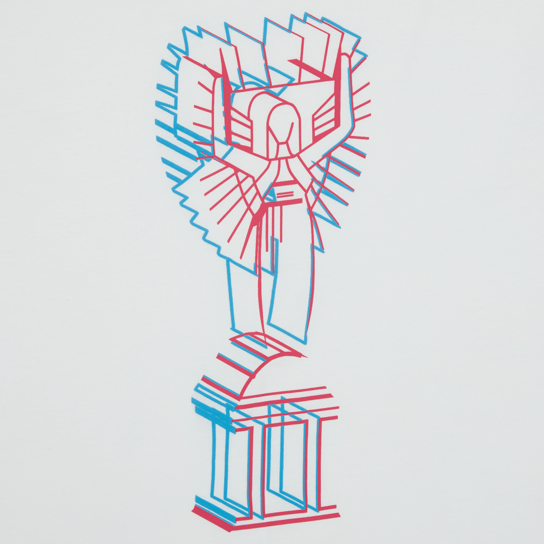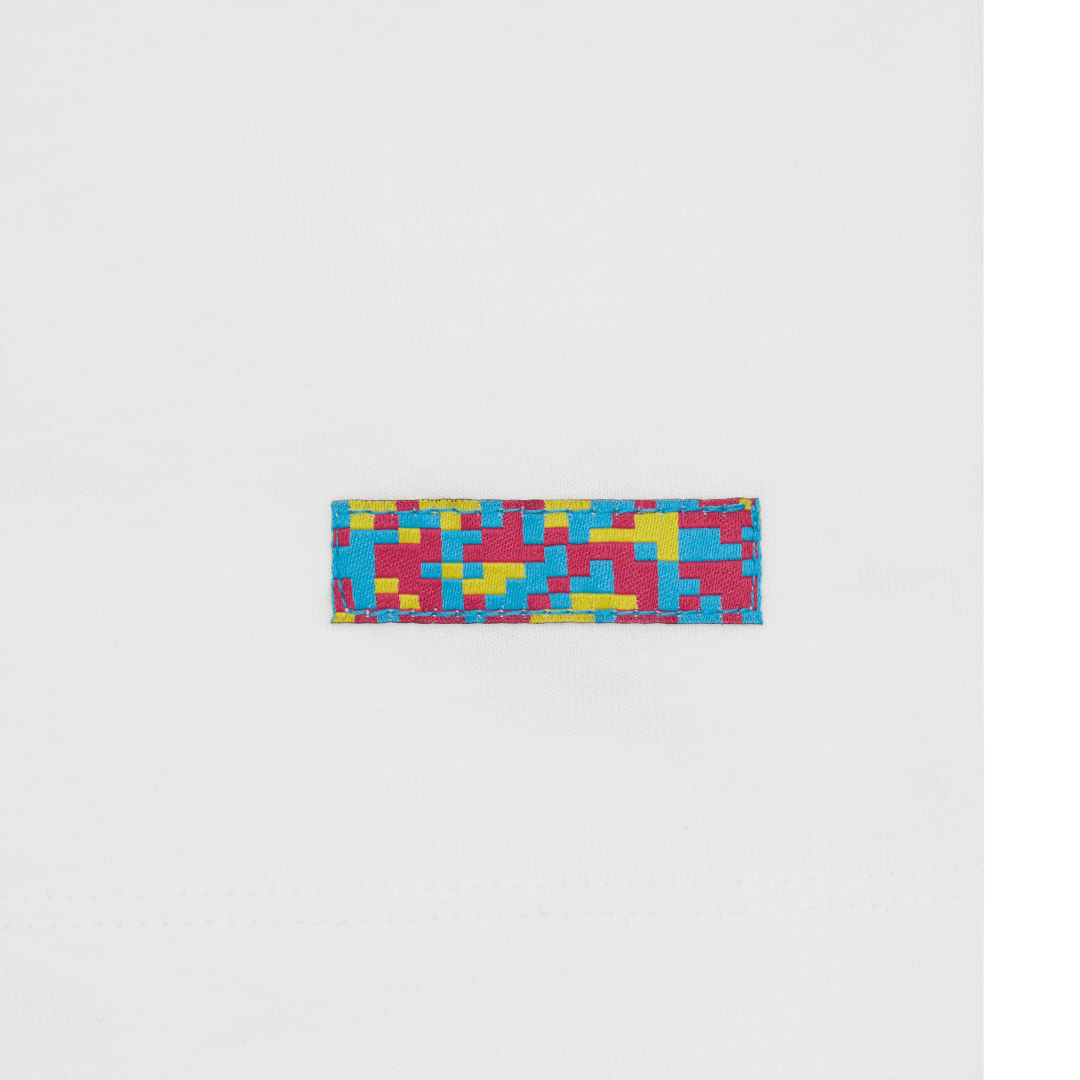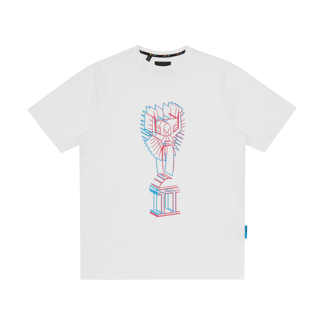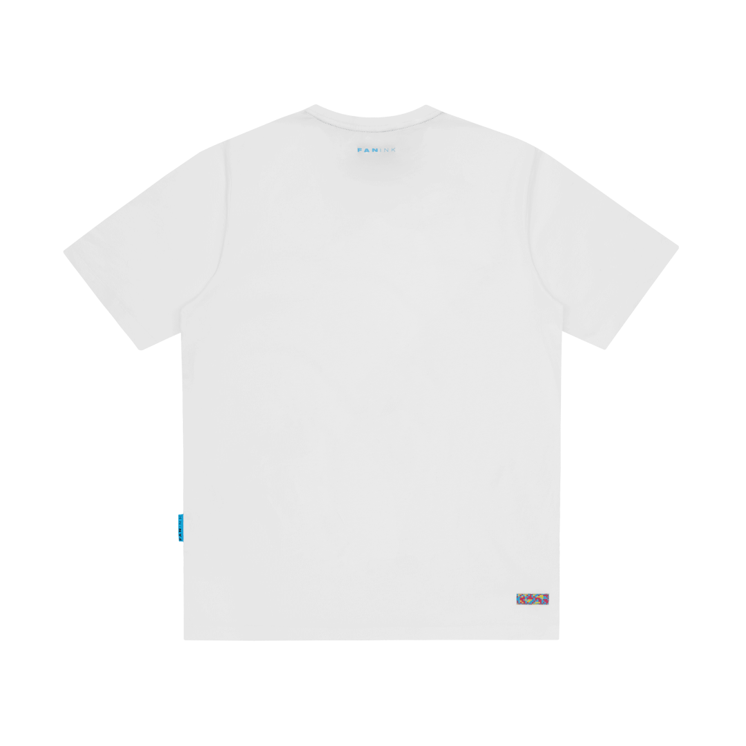 Neon blue and pink angel screen print at front. Fan Ink screen print at top back. Fan Ink woven label at side. Fan Ink digital camo label at back hem. Made in Portugal.